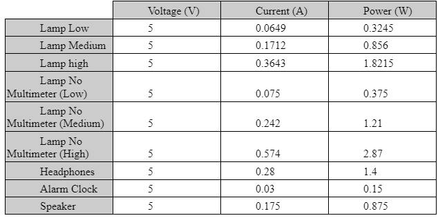 The first step was to quantify the power draw of various small USB devices to better understand what power the system would need to be able to deliver. As seen in Appendix 1, based on the USB protocol, the device needs to be able to deliver power at 5VDC[1], and the current will vary based on the device plugged in. In testing, the maximum amount of power draw was 2.87W which is what drove the power requirements for the system.