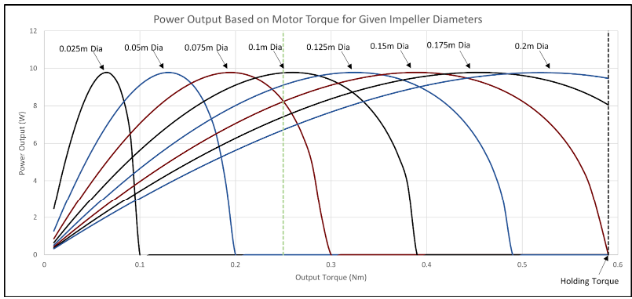 A parametric equation was derived for impeller turbine efficiency from motor torque and impeller diameter. See Appendix 10 for the calculation summary. It is known that speed is roughly inversely proportional to torque, however, since the exact relation is unknown, the motor torque was assumed to be around half the holding torque. Using this calculation, the ideal impeller diameter was determined to be 100mm. See Appendix 11.