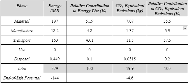 Appendix 14 illustrates the relative contribution of energy consumption and CO2 equivalent emissions of the device throughout its life cycle stages. The materials phase contributes approximately 45% of total energy consumption and 35% of CO2-eq emissions. The transportation phase significantly impacts both indicators, accounting for about 43% of energy consumption and 57% of CO2-eq emissions. The manufacturing stage has a small impact, and the use stage has no contribution. The disposal stage's impact is negligible, while the end-of-life (EoL) potential shows significant benefits from recycling or remanufacturing, reducing overall energy consumption and CO2-eq emissions by approximately 30%.