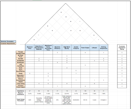 A QFD was built to see how the user requirements correlate with the technical parameters. The sub-systems were then designed to match the output of the QFD. Specifically, high build quality, and high power output were found to be the most important factors, so extra time was allotted into refining these parameters. The goal was to minimize clearances, use high-quality materials, and minimize leakage where possible. Also, the aim was to have enough power to power charge a phone (around 500 mA). See Appendix 2 for QFD.