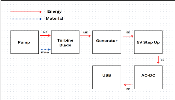 The objective of the project was to develop a system that efficiently harvests energy from water and delivers it to the user through a USB port. Through utilizing the Quality Function Deployment (QFD) process, electrical, mechanical, and user requirements were established. User surveys highlighted the importance of reliability, safety, and efficiency, guiding the design priorities.