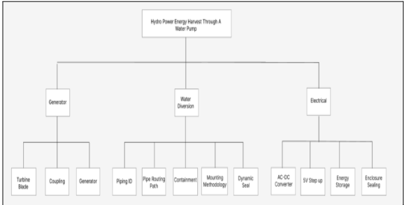 Beginning with a functional decomposition the high-level objective was broken down; convert kinetic energy from moving water from a pump into power that can operate a small USB device (See Appendix 3). Next, the functional decomposition was broken down into a physical decomposition, identifying components that would be needed for the system (See Appendix 4).