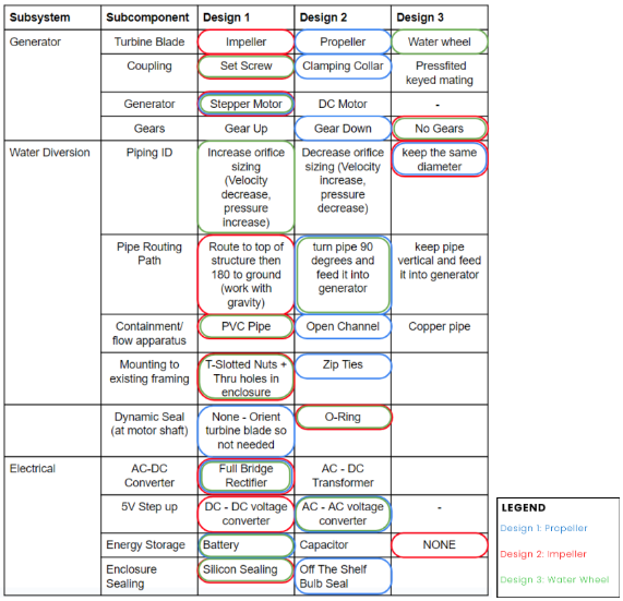 As shown in Appendix 5, a morphological chart was used to systematically explore and evaluate different design configurations. The system was broken down into subcomponents, such as the turbine blade, coupling, and generator, and identified design options for each. This structured approach allowed us to consider a wide range of possibilities and combinations.