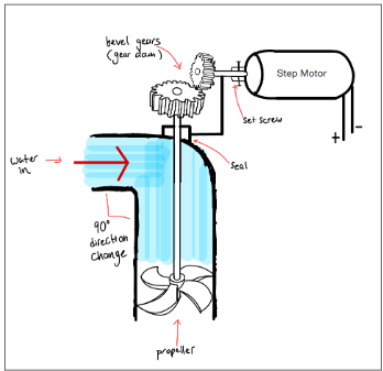 ‍The propeller design is a simple and proven design, commonly used in boats [2]. It features a 90-degree direction change. However, this design has its drawbacks, including the possibility of lost work and difficulty in sealing the shaft to the elbow [2]. See Appendix 6.