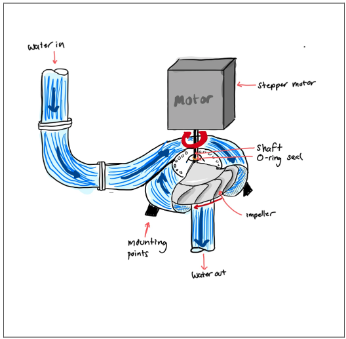 In terms of mechanical improvement, an o-ring dynamic seal would be used to seal the spinning shaft against the housing [16]. Different impeller shapes would be tested to determine which impeller most effectively moves water flow to the exit and provides the most power output. The impeller shape will be altered to reduce losses and increase efficiency. The bolt pattern would be altered again for easier serviceability since currently there are a lot of bolts in awkward positions.