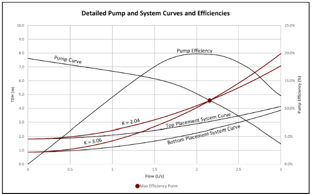 The impeller was designed to operate at the pump’s maximum efficiency point (to minimize losses throughout the system). At that point, the bottom placement has 0.57m less head loss compared to the top placement. This equates to around an extra 12.1W. See Appendix 9.